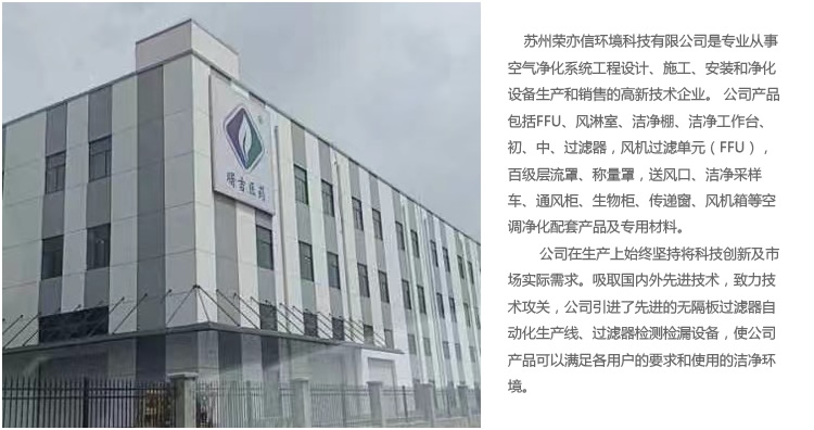 蘇州榮亦信環(huán)境科技有限公司是專業(yè)從事空氣凈化系統(tǒng)工程設(shè)計(jì)、施工、安裝和凈化設(shè)備生產(chǎn)和銷售的企業(yè)。 公司產(chǎn)品包括FFU、風(fēng)淋室、潔凈棚、潔凈工作臺(tái)、初、中、過濾器,風(fēng)機(jī)過濾單元(FFU),百級(jí)層流罩、稱量罩,送風(fēng)口、潔凈采樣車、通風(fēng)柜、生物安全柜、傳遞窗、風(fēng)機(jī)箱等空調(diào)凈化配套產(chǎn)品及專用材料。公司在生產(chǎn)上始終堅(jiān)持將科技創(chuàng)新及市場(chǎng)實(shí)際需求。吸取國(guó)內(nèi)外先進(jìn)技術(shù),致力技術(shù)攻關(guān),公司引進(jìn)了先進(jìn)的無(wú)隔板過濾器自動(dòng)化生產(chǎn)線、過濾器檢測(cè)檢漏設(shè)備,使公司產(chǎn)品可以滿足各用戶的要求和使用的潔凈環(huán)境。公司擁有技術(shù)專業(yè)的科技人員,專業(yè)的設(shè)備制作人員,工程安裝施工人員,我公司不斷創(chuàng)新,不斷發(fā)展,致力于空調(diào)凈化系統(tǒng)的新設(shè)備、新技術(shù)的研發(fā)和生產(chǎn)。